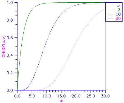 Function imsl_f_chi_squared_cdf evaluates the distribution function, F(x,ν), of a chi‑squared random variable x = chi_squared with ν = df degrees of freedom, where: