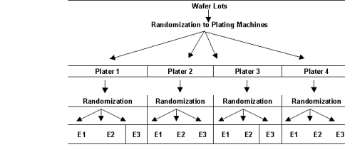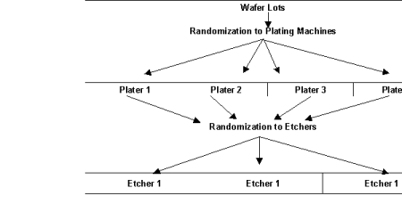 Notice that although there are only three etchers, 12 different runs are made using these etchers. The wafers randomly assigned to the first plater and first etcher are processed separately from the wafers assigned to other plating machines.