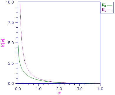 Since K0(x) is complex for negative x and is undefined at x = 0, imsl_f_bessel_K0 is defined only for x > 0. For large x, imsl_f_bessel_K0 will underflow.