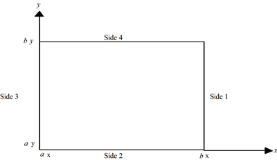 on the rectangular domain (ax, bx) × (ay, by) with a user-specified combination of Dirichlet (solution prescribed), Neumann (first-derivative prescribed), or periodic boundary conditions. The sides are numbered clockwise, starting with the right side.