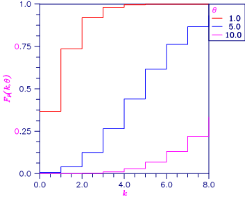 The function imsl_f_poisson_cdf evaluates the distribution function of a Poisson random variable with parameter theta. The mean of the Poisson random variable, theta, must be positive. The probability function (with θ = theta) is