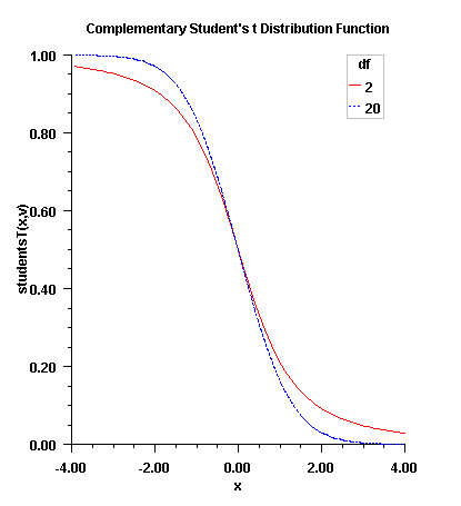 Function imsls_f_complementary_t_cdf evaluates one minus the distribution function of a Student’s t random variable with ν = df degrees of freedom. If t2 ≥ ν, the following identity relating the complementary Student’s t cumulative distribution function, denoted by , to the incomplete beta ratio function