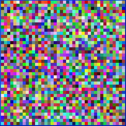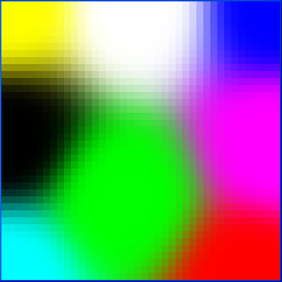 This example creates a Kohonen network with 40 × 40 nodes. Each node has three weights, representing the RGB values of a color. This network is trained with eight colors using 500 iterations. Then, the example prints out a forecast result. Initially, the image of the nodes is: