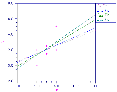 Different straight line fits to a data set are computed under the criterion of minimizing the Lp norm by using p equal to 1, 1.5, 2.0 and 2.5.
