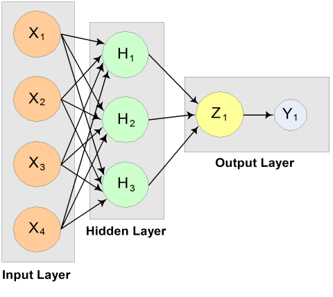 The structure of the network consists of four input nodes ands two layers, with three perceptrons in the hidden layer and one in the output layer. The following figure illustrates this structure: