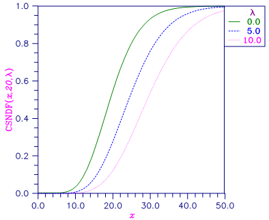 Function imsls_f_non_central_chi_sq determines the point at which the Poisson weight is greatest, and then sums forward and backward from that point, terminating when the additional terms are sufficiently small or when a maximum of 1000 terms have been accumulated. The recurrence relation 26.4.8 of Abramowitz and Stegun (1964) is used to speed the evaluation of the central chi-squared distribution functions.