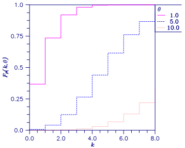 Function imsls_f_poisson_cdf evaluates the distribution function of a Poisson random variable with parameter theta. The mean of the Poisson random variable, theta, must be positive. The probability function (with θ = theta) is as follows: