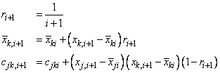 denote the mean based on i observations for the k-th variable, and let cjki denote the sum of crossproducts (or sum of squares if j = k) based on i observations. Then, the method of provisional means finds new means and sums of crossproducts as follows: