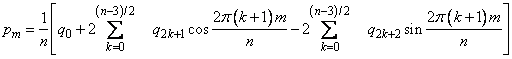 We will assume that n is odd for the remainder of this discussion. The function imsl_f_fft_real treats this sequence as if it were periodic of period n. In particular, it assumes that f(t0) = f(t0 + nΔ). Hence, the period of the function is assumed to be T = nΔ. We can invert the above transform for p as follows: