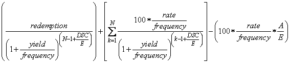 In the above equation, DSC represents the number of days in the period starting with the settlement date and ending with the next coupon date. E represents the number of days within the coupon period. N represents the number of coupons payable in the timeframe from the settlement date to the redemption date. A represents the number of days in the timeframe starting with the beginning of coupon period and ending with the settlement date.