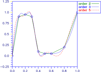 The optional argument IMSL_ORDER allows the user to choose the order of the spline interpolant. The optional argument IMSL_KNOTS allows user specification of knots.