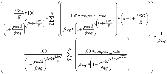 In the equation above, DSC represents the number of days starting with the settlement date and ending with the next coupon date. E represents the number of days within the coupon period. N represents the number of coupons payable from the settlement date to the maturity date. freq represents the frequency of the coupon payments annually.