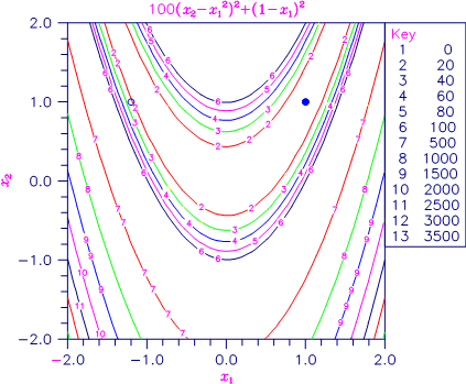 is minimized with the initial guess x = (−1.2, 1.0). The initial guess is marked with an open circle in the figure on page 20.