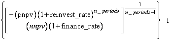 where pnpv is calculated from imsl_f_net_present_value for positive values in values using reinvest_rate, and where nnpv is calculated from imsl_f_net_present_value for negative values in values using finance_rate.