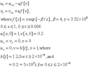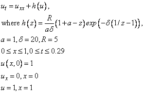 This is a non-linear problem. The output shows a case where a rapidly changing front, or hot-spot, develops after a considerable way into the integration. This causes rapid change to the grid. An option sets the maximum order BDF formula from its default value of 2 to the theoretical stable maximum value of 5.
