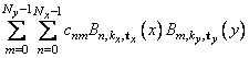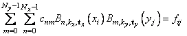 The simplest method of obtaining multivariate interpolation and approximation functions is to take univariate methods and form a multivariate method via tensor products. In the case of two-dimensional spline interpolation, the derivation proceeds as follows. Let tx be a knot sequence for splines of order kx, and tv be a knot sequence for splines of order kv. Let Nx + kx be the length of tx, and Nv + kx be the length of tv. Then, the tensor-product spline has the following form.