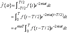 where the vector f h = (f(−T/2), ¼, f( (n − 1)h − T/2)). Thus, after scaling the components by (−1)jh, the discrete Fourier transform, as computed in imsl_c_fft_complex (with input f h) is related to an approximation of the continuous Fourier transform by the above formula.