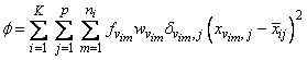 where νim denotes the row index of the m-th observation in the i-th cluster in the matrix X; ni is the number of rows of X assigned to group i; f denotes the frequency of the observation; w denotes its weight; δ is 0 if the j-th variable on observation νim is missing, otherwise δ is 1; and