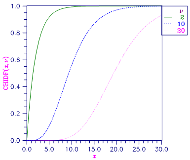 Function imsl_f_chi_squared_cdf evaluates the distribution function, F(x, ν), of a chi-squared random variable x = chi_squared with ν = df degrees of freedom, where: