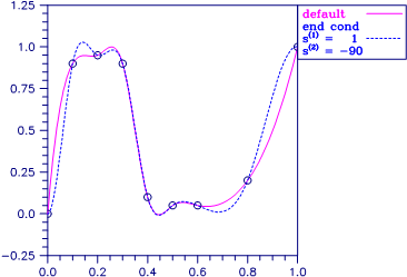 The difference between the default (“not-a-knot”) spline and the interpolating cubic spline, which has first derivative set to 1 at the left end and the second derivative set to −90 at the right end, is illustrated in the following figure.