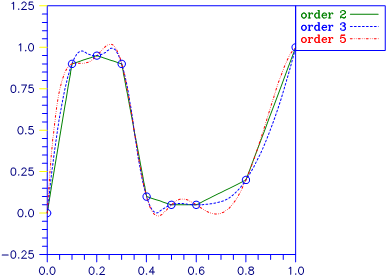 Three spline interpolants of order 2, 3, and 5 are plotted. These splines use the default knots.