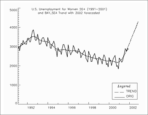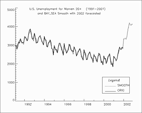 This example uses unadjusted unemployment for women over 20 years of age in the U.S. for 1991‑2001, as reported by the U.S. Bureau of Labor Statistics (www.bls.gov). Figure 1, , Sample Smoothed Predictions from BAY_SEA displays this data together with the smoothed preditions from BAY_SEA. Figure 2, , Sample Trend Predictions from BAY_SEA displays the same data with trend predictions from BAY_SEA.
