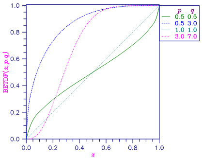 Function BETDF evaluates the cumulative distribution function of a beta random variable with parameters PIN and QIN. This function is sometimes called the incomplete beta ratio and, with p = PIN and q = QIN, is denoted by Ix(p, q). It is given by