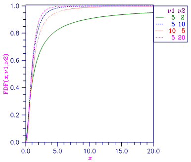 Function FDF evaluates the distribution function of a Snedecor’s F random variable with DFN numerator degrees of freedom and DFD denominator degrees of freedom. The function is evaluated by making a transformation to a beta random variable and then using the routine BETDF. If X is an F variate with ν1 and ν2 degrees of freedom and Y = ν1X/(ν2 + ν1X), then Y is a beta variate with parameters p = ν1/2 and q = ν2/2. The function FDF also uses a relationship between F random variables that can be expressed as follows.