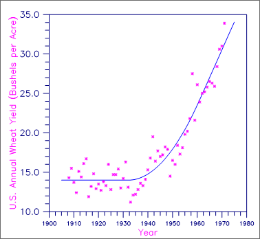 Figure 1, Annual U.S. Wheat Yield and a Grafted Polynomial Fit