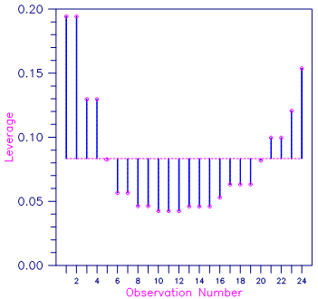 Figure 2, Plot of Leverages hi and the Average (p/n = 2/24)