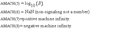 3. The IEEE standard for binary arithmetic (see IEEE 1985) specifies quiet NaN (not a number) as the result of various invalid or ambiguous operations, such as 0/0. The intent is that AMACH(6) return a quiet NaN. On IEEE format computers that do not support a quiet NaN, a special value near AMACH(2) is returned for AMACH(6). On computers that do not have a special representation for infinity, AMACH(7) returns the same value as AMACH(2).