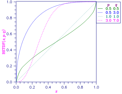 where G(×) is the gamma function. The value of the distribution function Ix(p, q) is the probability that the random variable takes a value less than or equal to x.