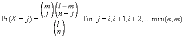 If k is greater than or equal to i and less than or equal to min(n, m), HYPDF sums the terms in this expression for j going from i up to k. Otherwise, HYPDF returns 0 or 1, as appropriate. So, as to avoid rounding in the accumulation, HYPDF performs the summation differently depending on whether or not k is greater than the mode of the distribution, which is the greatest integer less than or equal to (m + 1)(n + 1)/(l + 2).