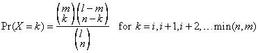 The function HYPPR evaluates the probability density function of a hypergeometric random variable with parameters n, l, and m. The hypergeometric random variable X can be thought of as the number of items of a given type in a random sample of size n that is drawn without replacement from a population of size l containing m items of this type. The probability density function is