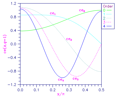 Evaluates a sequence of even, periodic, integer order, real Mathieu functions.