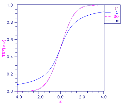 Function TDF evaluates the cumulative distribution function of a Student's t random variable with DF degrees of freedom. If the square of T is greater than or equal to DF, the relationship of a t to an F random variable (and subsequently, to a beta random variable) is exploited, and routine BETDF is used. Otherwise, the method described by Hill (1970) is used. Let ν = DF. If ν is not an integer, if ν is greater than 19, or if ν is greater than 200, a Cornish-Fisher expansion is used to evaluate the distribution function. If ν is less than 20 and ABS(T) is less than 2.0, a trigonometric series (see Abramowitz and Stegun 1964, equations 26.7.3 and 26.7.4, with some rearrangement) is used. For the remaining cases, a series given by Hill (1970) that converges well for large values of T is used.