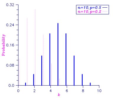 To avoid the possibility of underflow, the probabilities are computed forward from 0, if k is not greater than n times p, and are computed backward from n, otherwise. The smallest positive machine number, ε, is used as the starting value for computing the probabilities, which are rescaled by (1 - p)nε if forward computation is performed and by pnε if backward computation is done.