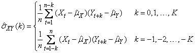 For computational purposes, the autocorrelations ρX(k) and ρY(k) and the cross-correlations ρXY(k) are replaced by their corresponding estimates for |k| ≤ K, and the limits of summation are equal to zero for all k such that |k| > K.