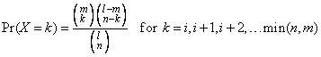 The function HYPPR evaluates the probability density function of a hypergeometric random variable with parameters n, l, and m. The hypergeometric random variable X can be thought of as the number of items of a given type in a random sample of size n that is drawn without replacement from a population of size l containing m items of this type. The probability density function is
