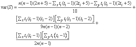 where ti is the number of ties in the x variable with the i-th tie value. Ty is calculated in a similar manner.