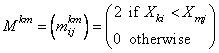 where Xki is the i-th observation in the k-th population, Xmj is the j-th observation in the m-th population, and each matrix Mkm is nk by nm where ni = NI(i). Let Skm denote the sum of all elements in Mkm. Then, STAT(2) is computed as the sum over all elements in Skm, minus the expected value of this sum (computed as