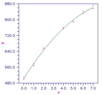 Routine RCURV computes estimates of the regression coefficients in a polynomial (curvilinear) regression model. In addition to the computation of the fit, RCURV computes some summary statistics. Sequential sums of squares attributable to each power of the independent variable (stored in SSPOLY) are computed. These are useful in assessing the importance of the higher order powers in the fit. Draper and Smith (1981, pages 101−102) and Neter and Wasserman (1974, pages 278−287) discuss the interpretation of the sequential sums of squares. The statistic R2 (stored in STAT(5)) is the percentage of the sum of squares of y about its mean explained by the polynomial curve. Specifically,