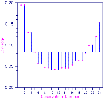 Figure 2- 3 Plot of Leverages hi and the Average (p/n = 2/24)