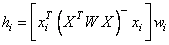 where W = diag(w1, w2, …, wn) and (XTW X)− denotes a generalized inverse of XTWX. The average value of the hi's is r/n. Regression routines declare xi unusual if hi > 2r/n. A row label X is printed beside a case that is unusual because of of xi. Hoaglin and Welsch (1978) call a data point highly influential (i.e., a leverage point) when this occurs.