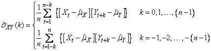 Let μX and σXX(k) denote the mean and autocovariance function of the Xt process; similarly, define μY and σYY(k), with respect to the Yt process. Define the cross-covariance function between Xt and Yt by