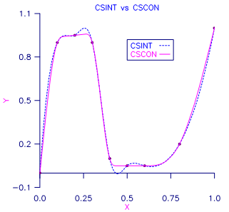 We first compute the shape-preserving interpolant using CSCON, and display the coefficients and breakpoints. Second, we interpolate the same data using CSINT in a program not shown and overlay the two results. The graph of the result from CSINT is represented by the dashed line. Notice the extra inflection points in the curve produced by CSINT.