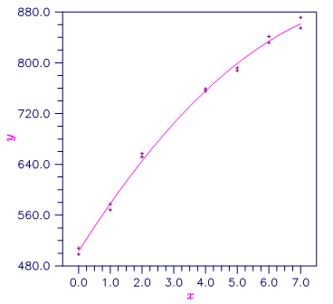 Routine RCURV computes estimates of the regression coefficients in a polynomial (curvilinear) regression model. In addition to the computation of the fit, RCURV computes some summary statistics. Sequential sums of squares attributable to each power of the independent variable (stored in SSPOLY) are computed. These are useful in assessing the importance of the higher order powers in the fit. Draper and Smith (1981, pages 101− 102) and Neter and Wasserman (1974, pages 278− 287) discuss the interpretation of the sequential sums of squares. The statistic R2 (stored in STAT(5)) is the percentage of the sum of squares of y about its mean explained by the polynomial curve. Specifically,