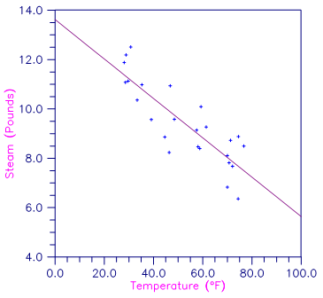 This example fits a line to a set of data discussed by Draper and Smith (1981, Table 1.1, pages 9− 33). The response y is the amount of steam used per month (in pounds), and the independent variable x is the average atmospheric temperature (in degrees Fahrenheit).