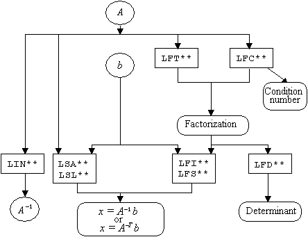 The paths using LSA** or LFI** use iterative refinement for a more accurate solution. The path using LSA** is the same as using LFC** followed by LFI**. The path using LSL** is the same as the path using LFC** followed by LFS**. The matrix inversion routines LIN** are available only for certain matrix types.