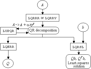 The QR decomposition of a matrix A consists of finding an orthogonal matrix Q, a permutation matrix P, and an upper trapezoidal matrix R with diagonal elements of nonincreasing magnitude, such that AP = QR. This decomposition is determined by the routines LQRRR or LQRRV. It returns R and the information needed to compute Q. To actually compute Q use LQERR. Figure 1-2 summarizes the relationships among the subroutines.